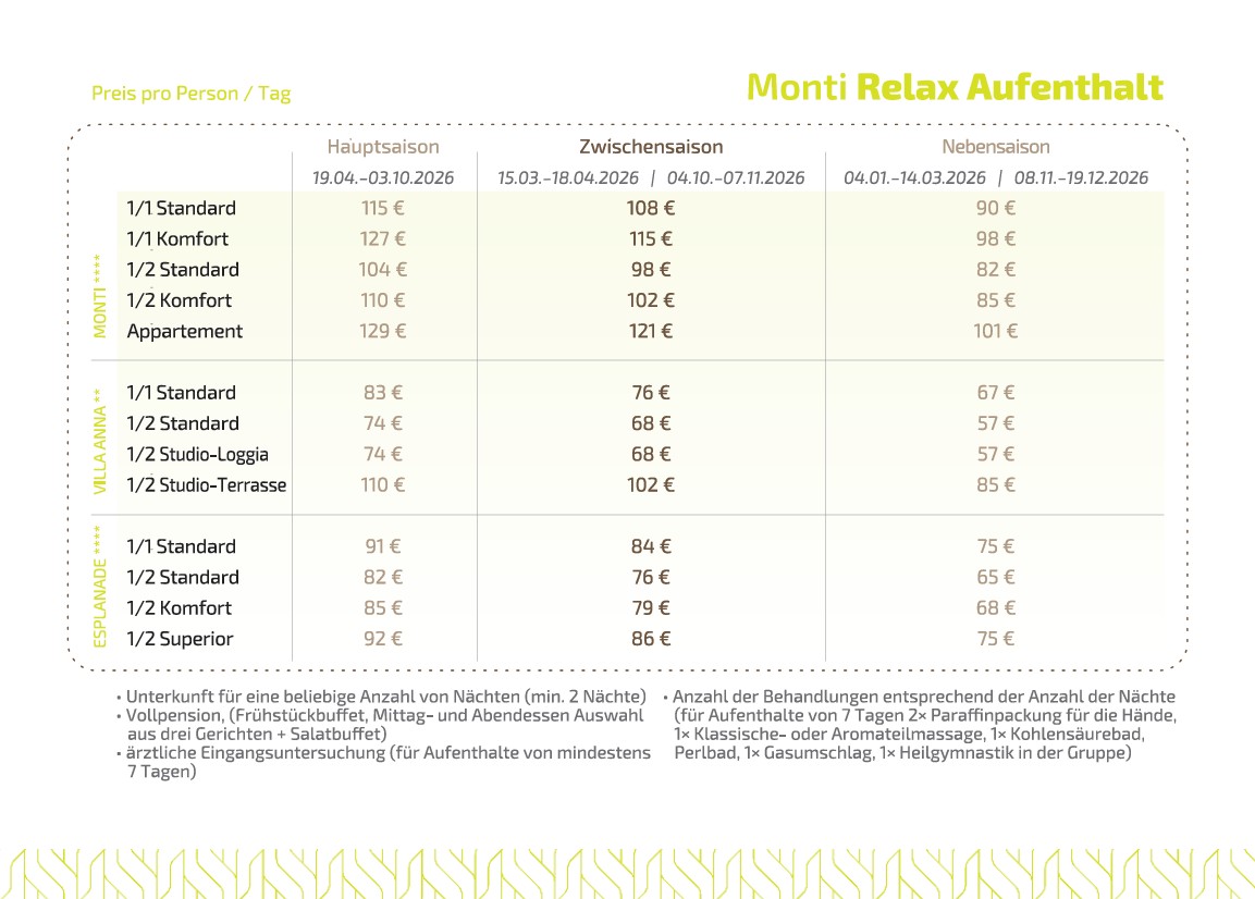 - die Anzahl der Prozeduren richtet sich nach der Anzahl der Nächte - beim Aufenthalt von 7 Nächten: 2x Paraffin Handwickel, 1x teilweise klassische Massage, 1x Kohlensäurebad, 1x Perlenbad, 1x Gaswickel und 1x Gruppenrehabilitationsübung