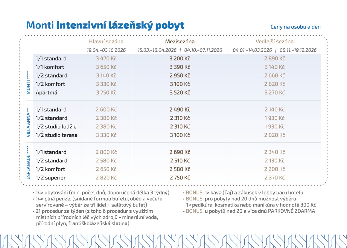 - 21 procedur za týden (z toho 6 procedur s využitím místních přírodních léčivých zdrojů - minerální voda, přírodní plyn, františkolázeňská slatina), procedury jsou podávány mimo neděli