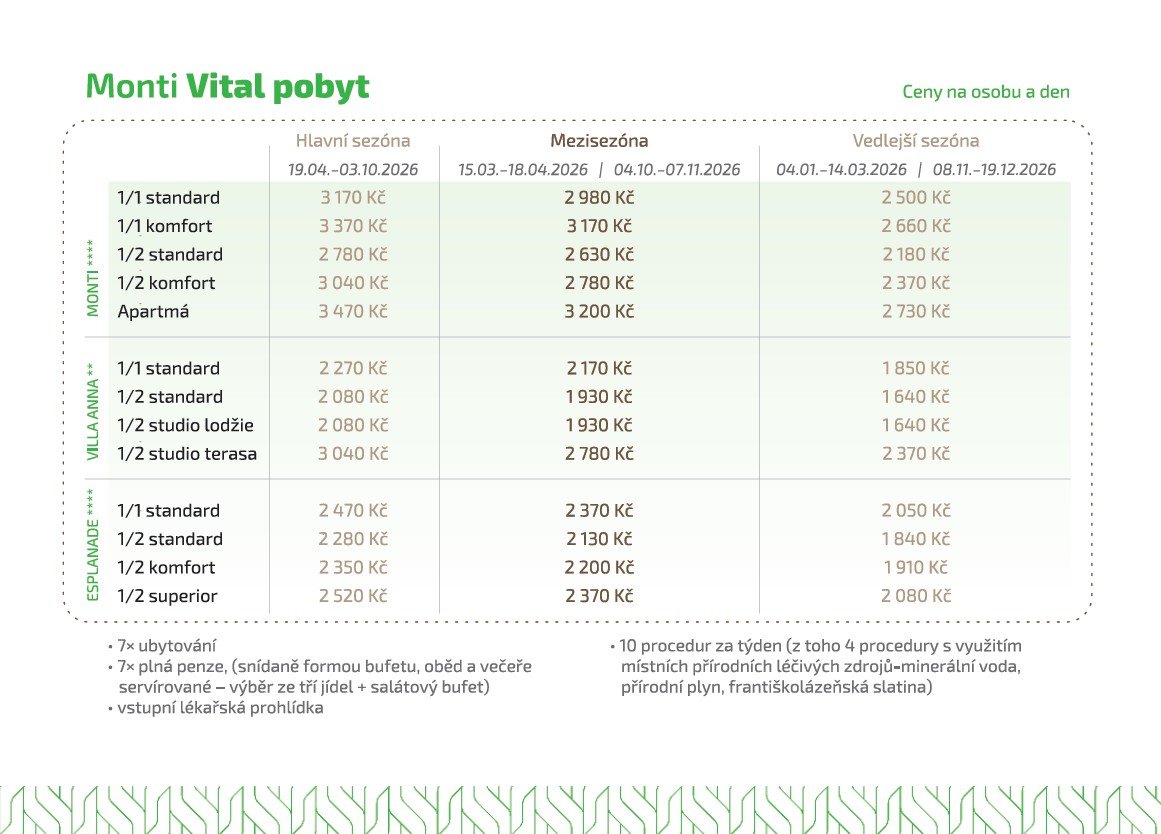 - 10 procedur za týden (z toho 4 procedury s využitím místních přírodních léčivých zdrojů - minerální voda, přírodní plyn, františkolázeňská slatina, procedury jsou podávány mimo neděli)